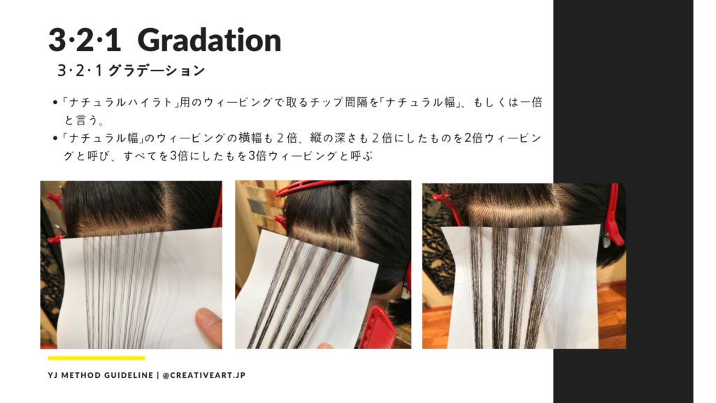 【YJ Method ハイライト】はこの「ナチュラルハイライト」を中心のスキルとしながら、日本人の髪質や今の時代のヘアスタイルに合わせて「デザインハイライト」テクニックと融合させ、繊細さと大胆さどちらも表現出来る様に進化させたものです。